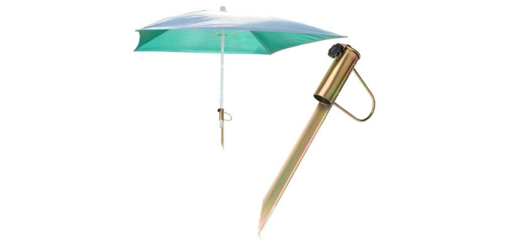 - Soportes de sombrilla con anclaje tipo «sand screw»: Estos soportes son similares a los anclajes en la arena, pero en lugar de ser una hélice, tienen una forma más alargada y plana que se clava en la arena girando. Son una opción popular para quienes prefieren una base más sólida.